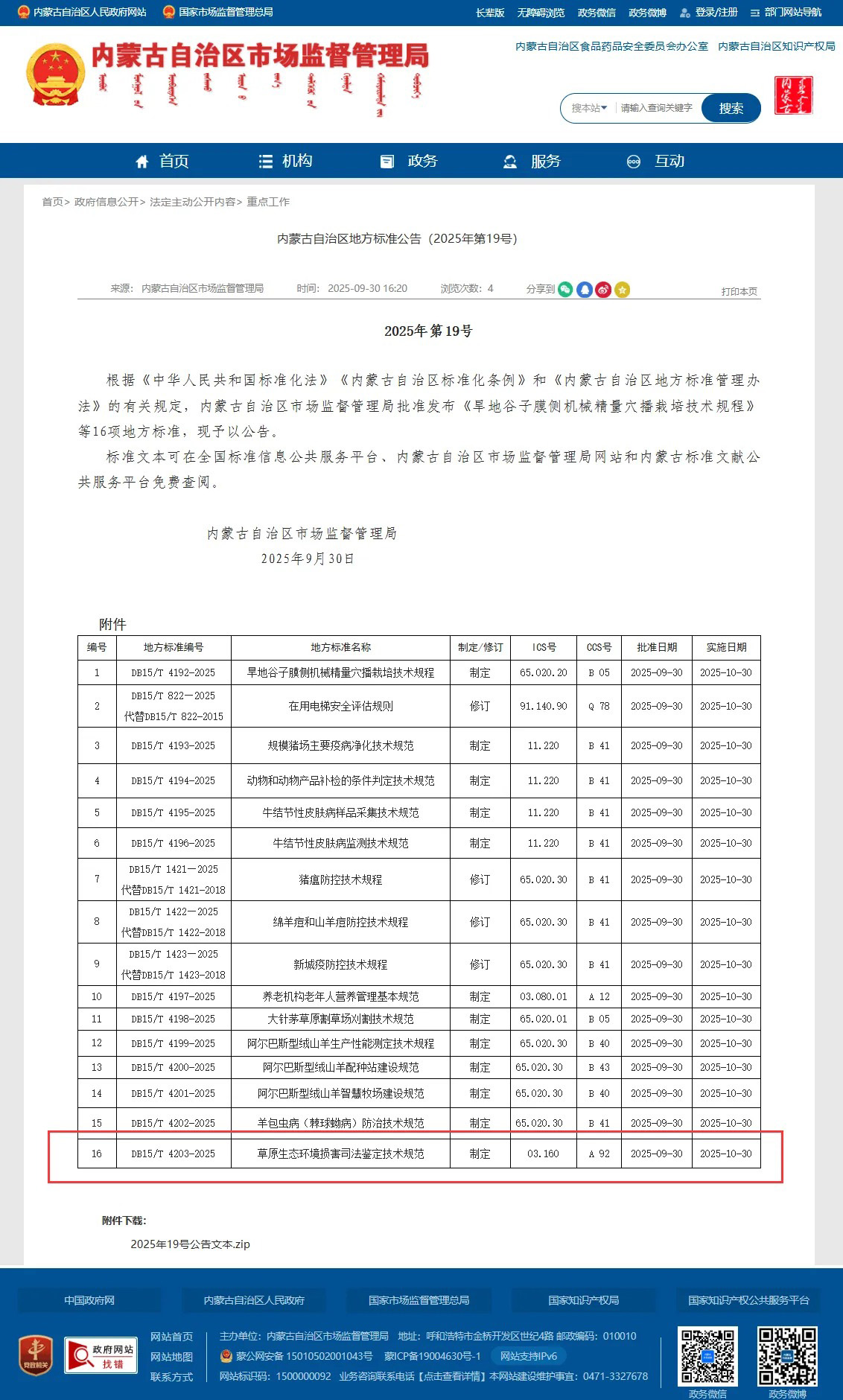 近日,由内蒙古环投环境损害司法鉴定中心负责起草的环境损害司法鉴定地方标准《草原生态环境损害司法鉴定技术规范》(DB15/T 4203-2025)在自治区市场监督管理局网站公告发布,并于2025年10月30日正式实施。该标准是全国首个聚焦草原生态环境损害司法鉴定的地方标准,标志着自治区生态环境损害司法鉴定技术标准取得重要进展,在解决草原生态环境损害司法鉴定、赔偿方面具有重要意义。